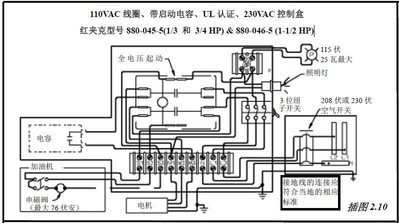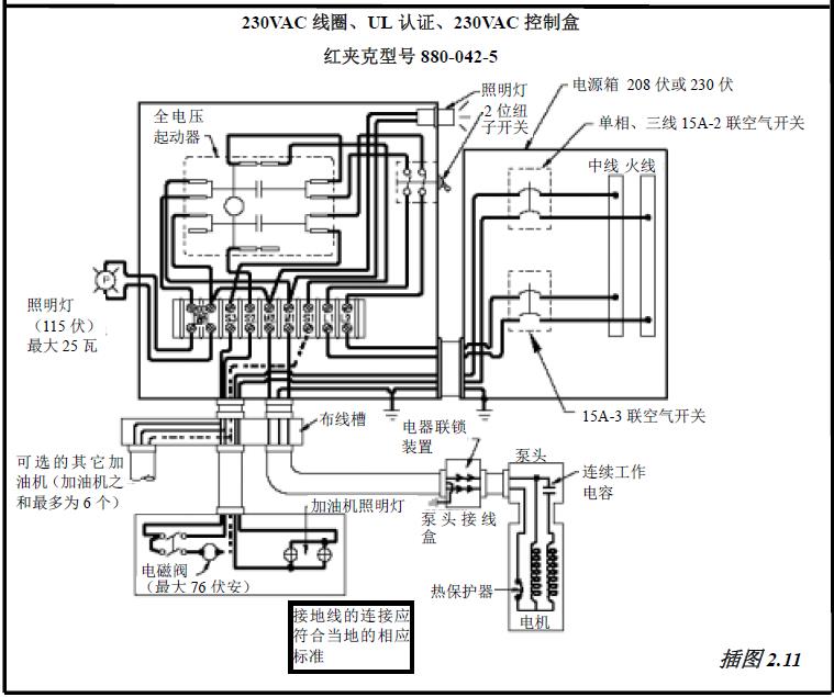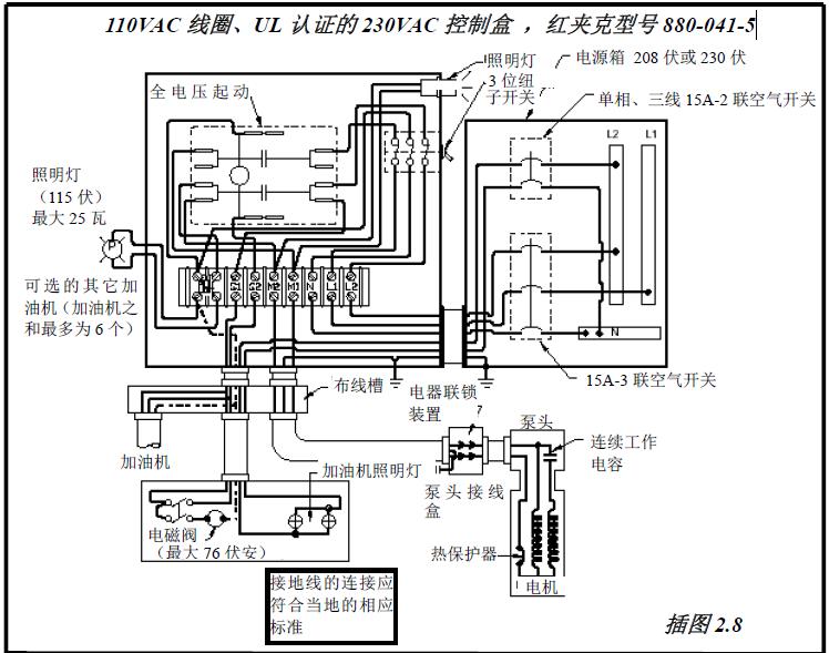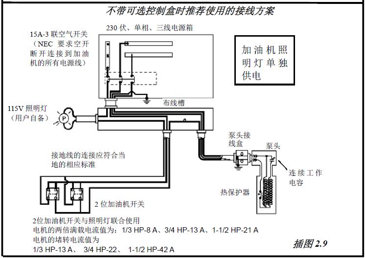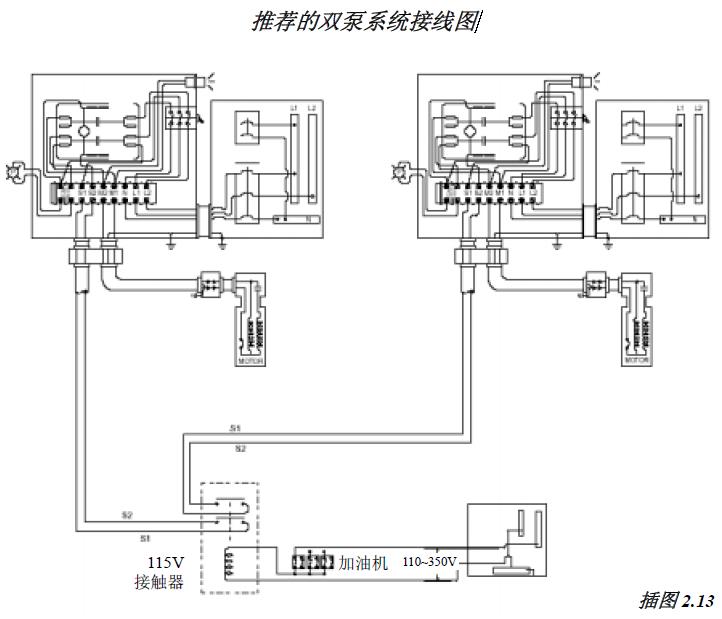 本图(插图2.13)为任意加油机控制组合两个潜泵都工作的接线图。如需单独工作,只需手动将控制盒侧壁商店开关关闭即可。