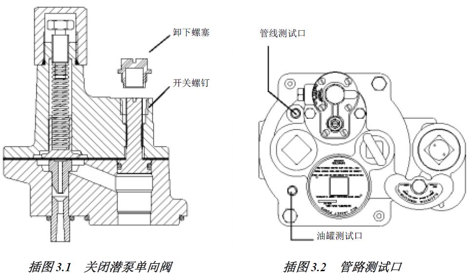 1: 关闭潜泵单向阀——尽可能向下拧单向阀口螺钉,在油罐测试口加压(参见插图3.2)