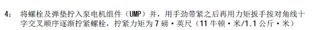 7: 代上泵电机组件连接螺栓和锁紧垫片。代上劲之后,在按十子交叉的位置拧紧。拧紧力矩为7 ft-lb(11 N•m)。