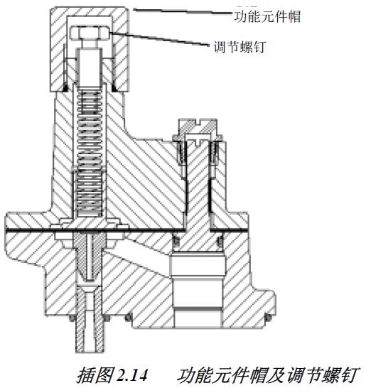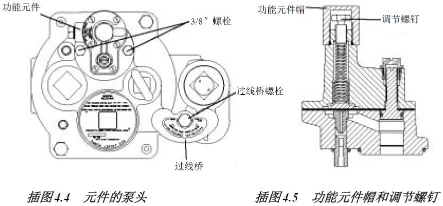本泵头上的功能元件是可调节型的。所有新的功能元件在出厂时卸压压力设置在11.5psi (79 kPa) 到 16 psi (93 kPa)之间,向下拧调节螺钉最大可调节到大约30 psi (207 kPa).