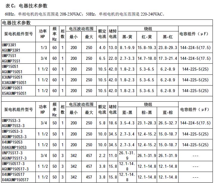 注意:1/3和3/4马力规格潜泵的电容为440V,17.5μF连续工作的带内漏电阻的。1-1/2马力规格潜泵的电容为440V,25μF连续工作的带内漏电阻的。