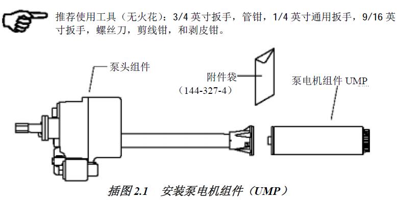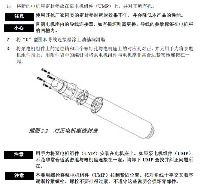 注意:用手力将泵电机组件(UMP)安装在电机座上。如果泵电机组件(UMP)不是非常合适紧密地与电机座连接在一起,请卸下UMP查找并纠正问题所在。